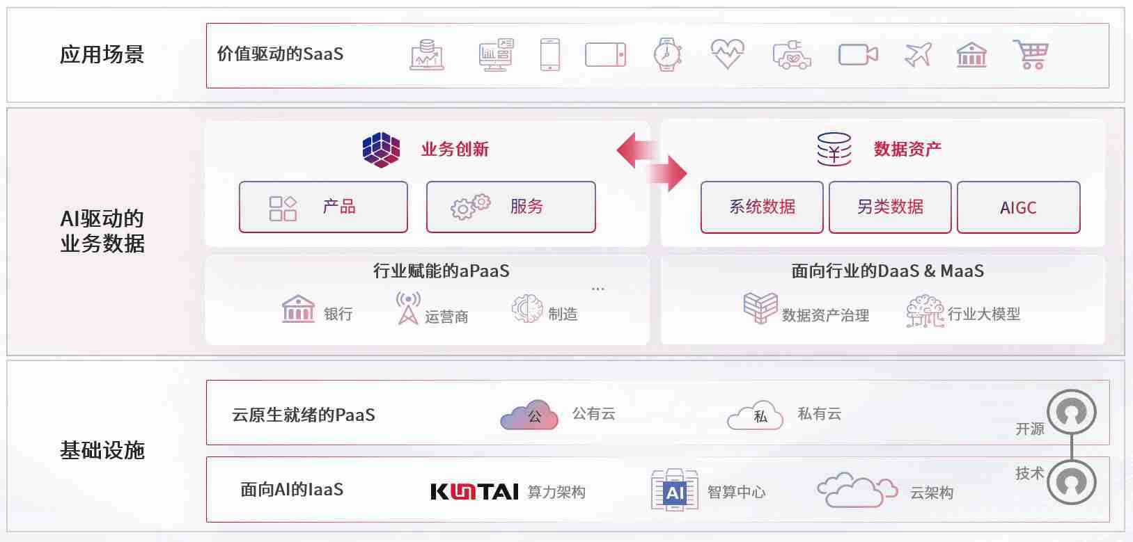 数字时代,,,,围绕企业数字化转型的关键要素,,,J9.COM数码开创性的提出数云融合战略和技术体系框架,,,,着力在云原生、、、、数字原生、、、、AI原生和信创产业上架构产品和服务能力,,为处在不同数字化转型阶段的快消零售、、、汽车、、、金融、、医疗、、、、政企、、、、教育、、、运营商等行业客户提供泛在的敏捷IT能力和融合的数据驱动能力,,,构建跨界融合创新的数字业务场景和新业务模式,,,,助力企业级客户建立面向未来的核心能力和竞争优势,,,,全面推动社会的数字化、、、、智能化转型升级。。