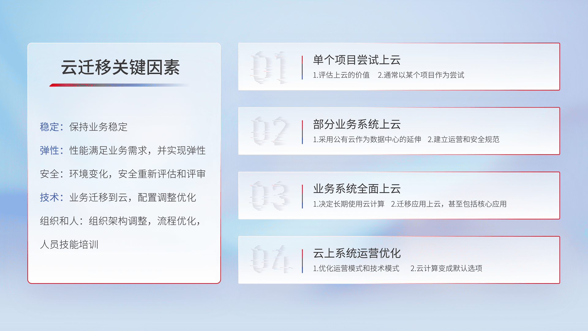 结合实际业务,,,,从规划设计、、、云平台选型、、、云原生改造、、、数据迁移、、集成交付,,迁移全过程为客户识别最佳上云路径,,做好风险识别管理,,设计网络架构、、、身份权限、、、安全审计合规、、、、操作审计、、、日志审计、、监控告警策略、、、多站点容灾设计等,,对云上基础设施进行整体规划,,,提升IT治理水平,,,,以满足弹性、、、、高可用、、、高性能的需求。。。。